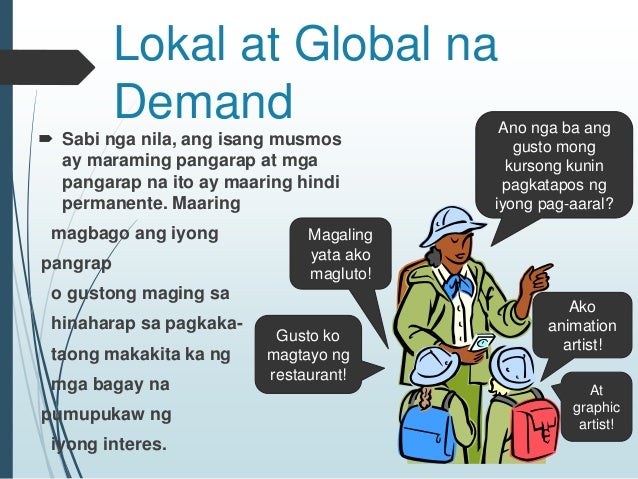 2 Get Iba pang mga katanungan. Kagustuhan Kakayahan Demand. 151 Natutukoy ang mga trabahong may mataas na lokal at global na demand 152 Nakikilala ang mga mapamilihang track o kursong akademik teknikal bokasyonal sining at disensyo at isports na angkop sa sariling talento kakayahan at hilig.