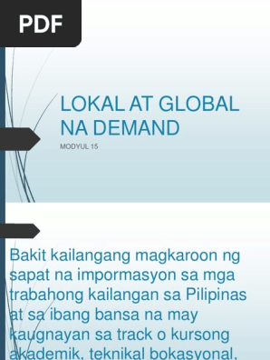 Ano ang kahulugan lokal na demand. Ang mabuting bunga ng lokal na Demand ay nagkakaroon ng madaming trabaho o hanapbuhay para sa mga lokal na mamamayan. Ang lokal na demand ay tumutukoy sa mga trabaho hanapbuhay o mga industriyang mayroong mataas na porsyento ng pangangailangan sa lokal o sa loob lamang ng isang bansa. Ano ang Law of Demand.