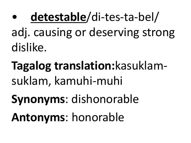 Ang kasuklam-suklam isang anito nakatayo sa hindi dapat kalagyan nito ay walang iba kundi si Satanas na kokontrol sa kaisipan na ang debosyon ay para anumang bagay maliban na lang sa Manlilikha. For a material thing thats disgusting gross use kadiri. English words for kasuklam-suklam include abominable detestable nefarious horrific horrible heinous despicable damnable ungracious and pitiful.