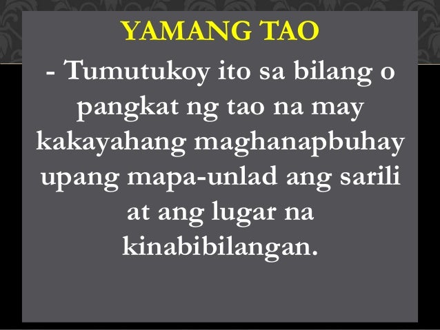 Ano ang Yamang Tao. Human resources ay isang mabilisang lumalawak na katawagang tumutukoy sa pamamahala o pangangasiwa ng puhunang mga tauhan o pondong mga tao ang mga tao ng isang samahan o organisasyon. 2pag-gawa ng mga gawaing bahay ng hindi inuutusanmag-walis mag-punas ng sahig 3wag i-utos sa kapatid kung kaya namang gawin.