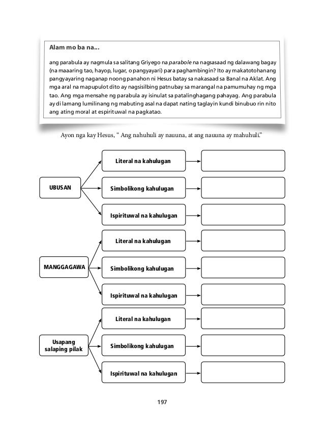 Ano ang ipiritwal kahulugan ng ubusan. Ano ang literal simboliko ispiritwal na kahulugan ng ubasan. Ano ang simbolikong kahulugan ng ubusan. Gawain 8 kaugnay na balita manood ng balita.