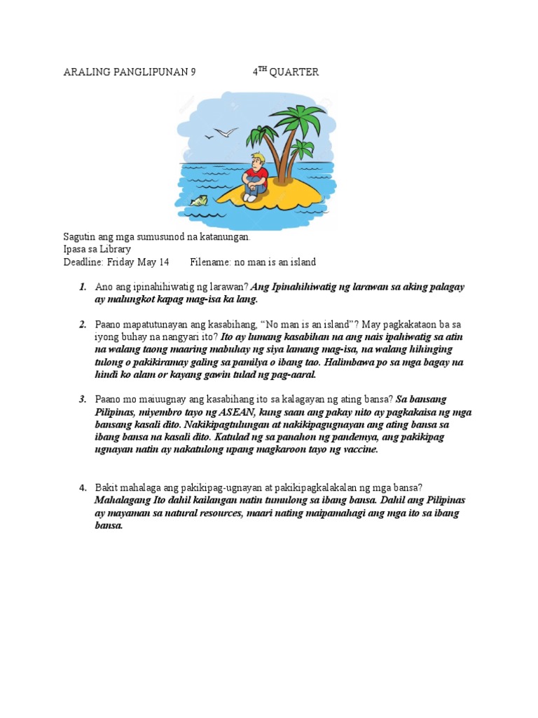 Kahulugan ng no man is an island. Kailangan natin ng kaibigan at karamay sa lahat ng oras. Human translations with examples. Mahalin ang sarili mahalin din ang kapwa tao.